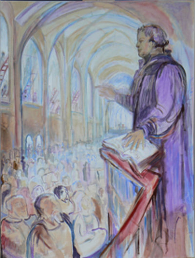 Die Zeit der Reformation beginnt in Zeitz mit dem Januar 1542, als Martin Luther hier in der Franziskanerkirche eine Predigt hielt. Wandel zeigt Luther auf der Kanzel predigen. Die linke Hand hat er auf die Bibel gelegt. Die angedeuteten Menschenmassen hören zu, drängen sich dicht um ihn. Man sieht die angelegten Leitern, denn in der Kirche war nicht genügend Platz für alle. Mit eindeutiger Gestik predigt Luther. Laut Beschreibung der Zeitzeugen kam es zu einem immensen Andrang, dass die Zuhörer der Predigt mit Leitern, die sie an die Wände und Mauern legten, denn die Kirche war voll, wenigstens etwas vom Reformator sehen wollten. Durch die Fenster konnten sie wenigstens etwas sehen. Luther weilte sehr oft in Zeitz, um die Gedanken der Reformation und die Umsetzung dieser zu unterstützen. 1544 kam er erneut für einige Tage zurück, und eigentlich wollte er sich in Zeitz niederlassen, weil er der Studenten in Wittenberg überdrüssig gewesen sein soll. Einige andere Lutherstätten haben sich ebenfalls in das Werk von Renate Wandel eingeschlichen und werden durch Andeutung, Abstraktion und Farben sichtbar. In Mischtechniken, in Übermalungen, in denen Schichtweise nach Symbol und Zeichen gegraben wird. So zeigt sie den großen Andrang bei der Predigt von Luther in der Franziskanerkirche , sie malte auch die Bausubstanz, man sieht die gotischen Fenster, wie auch das alte Mauerwerk. Aber Wandel schlägt noch weitere Brücken und Bögen zur Geschichte und Zeit der Reformation, denn jene kulturreiche Zeit kann sich nur in Farben niederschlagen. Sie malt noch andere Stationen von Luther, die in der Zeit der Reformation wichtig waren. Ihre Bilder können großformatig oder kleinformatig sein.