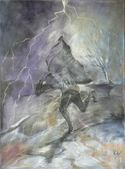 Luther schwor bei der heiligen Anna Mönch zu werden, als er dem Tod durch Blitzschlag am 2. Juli 1505 entkam. Wandel zeigt jenen Moment in einer ihr typischen Dramatik in Farbe und Form, gewaltig und leuchtend zugleich.